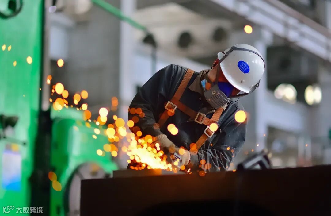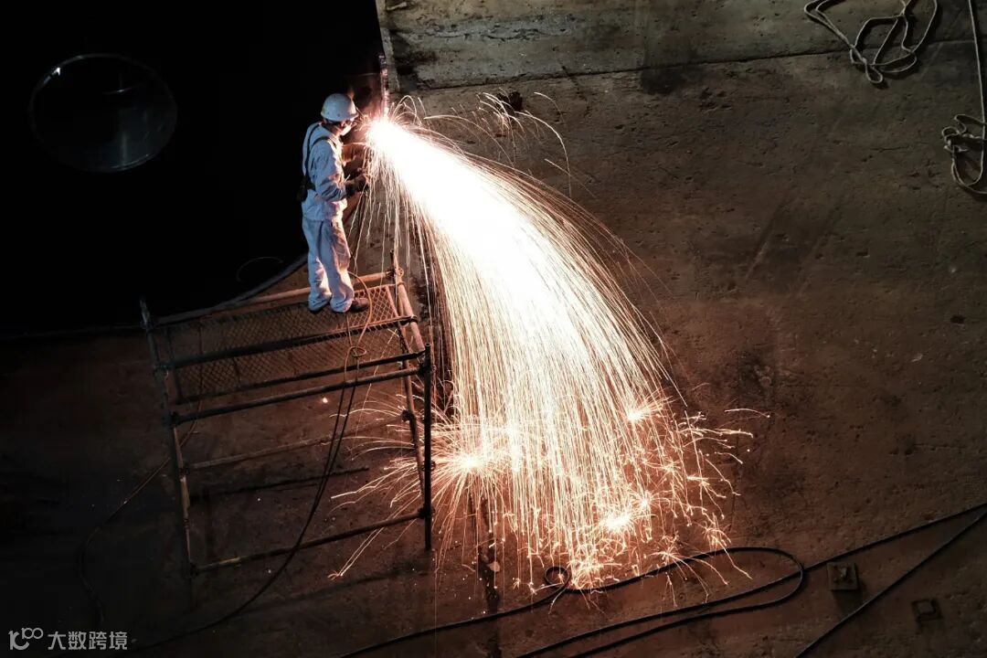 工人正在切割作业,飞溅洒落的铁花如同流星雨,照亮了他的身影。