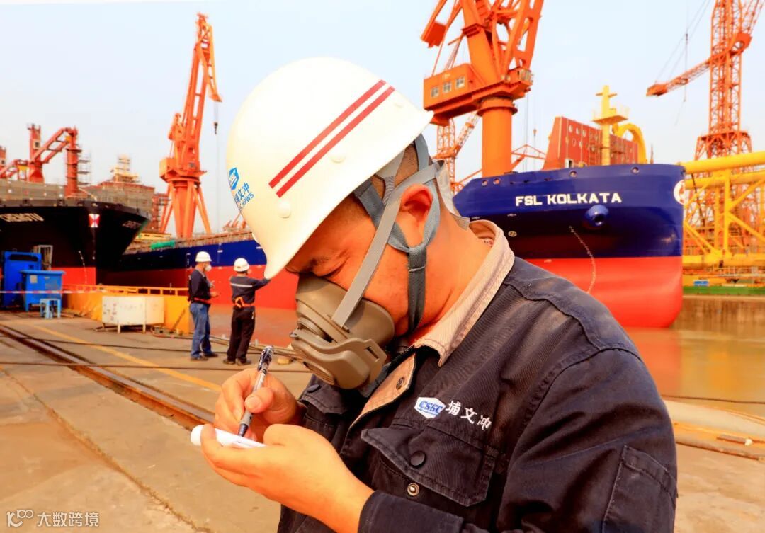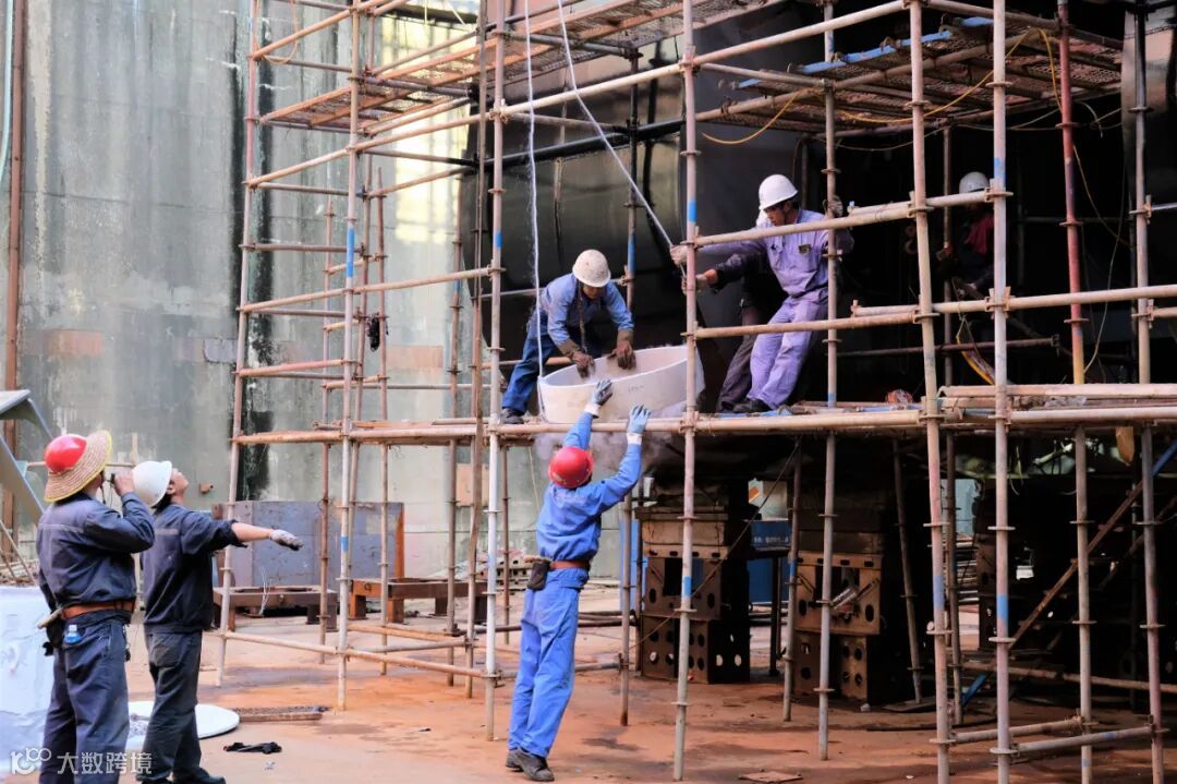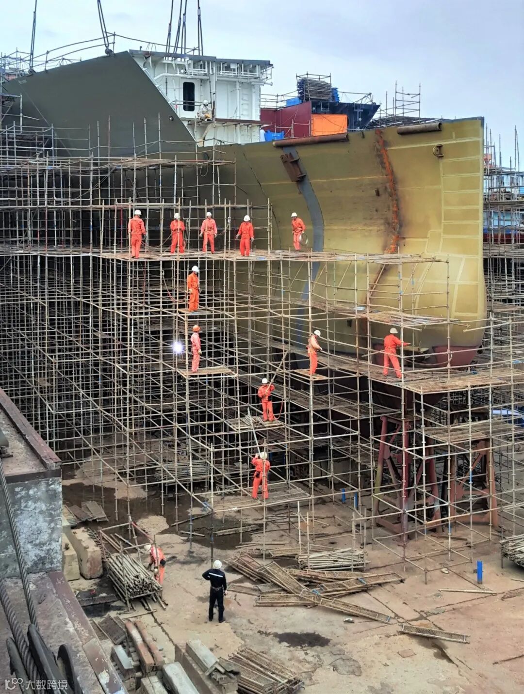 坞内,工人们有条不紊地在2150TEU集装箱船首部搭设脚手架,中间的巨轮如同正在破茧而出。