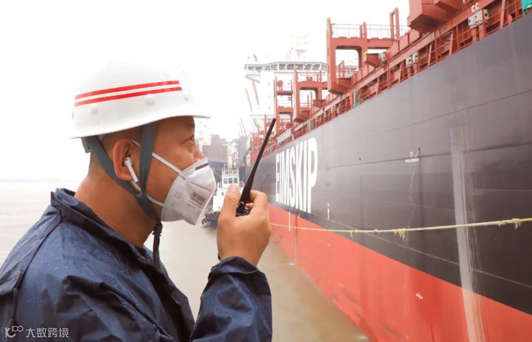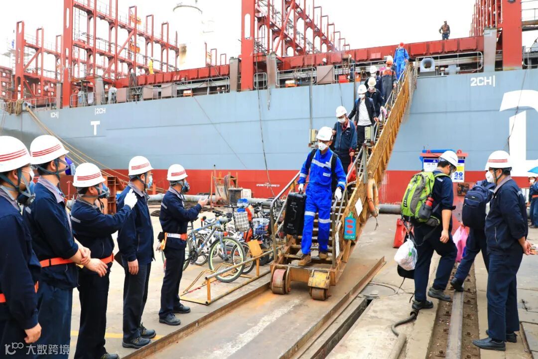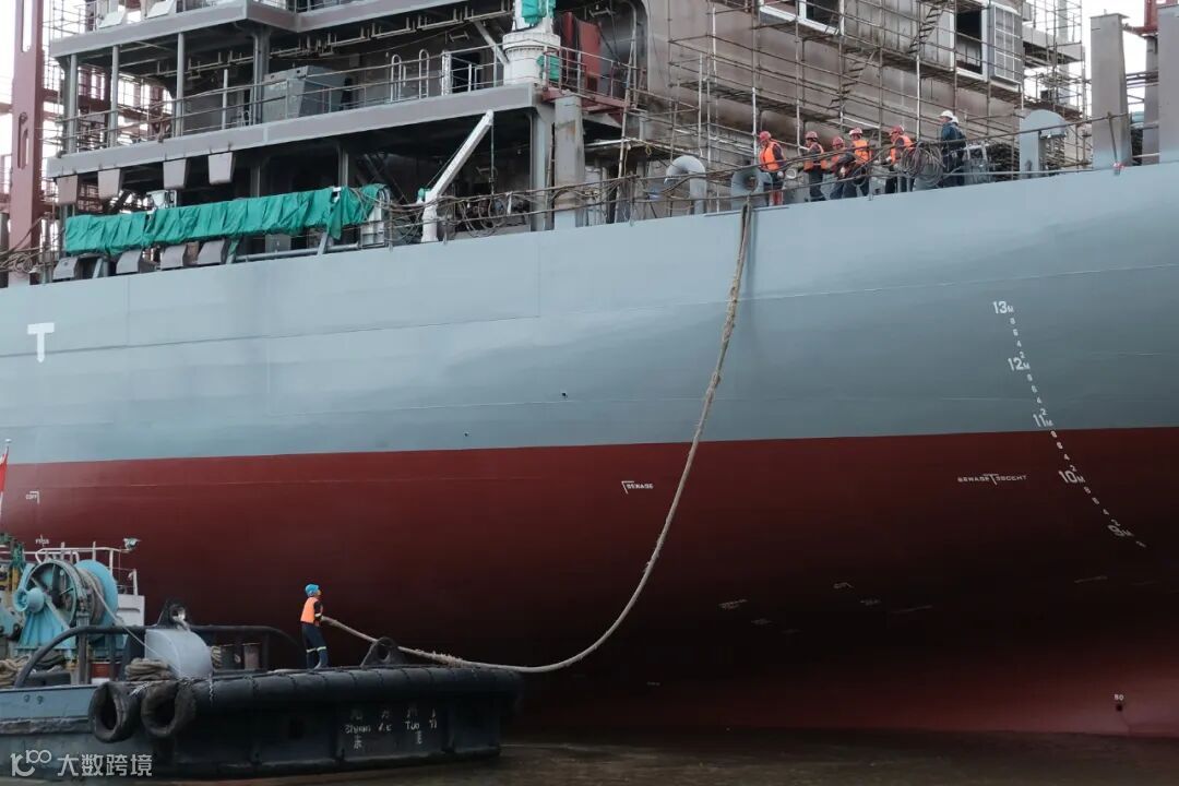600FEU集装箱船出坞,工人们合作把缆绳拖至船上。
