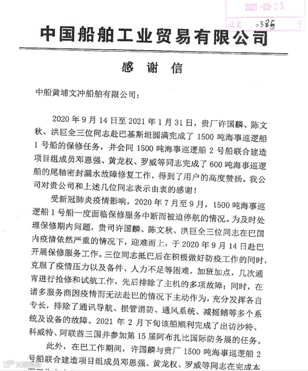 2021年3月23日,公司收到中船贸易公司发来的感谢信,信中对许国麟、陈文秋、洪巨全、邓恩强、黄龙权、罗威等同志在巴圆满完成系列海事巡逻船保修任务表示高度赞扬,同时也表示了对黄埔文冲的由衷感谢。