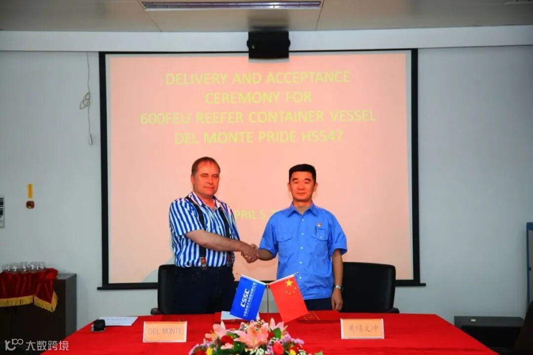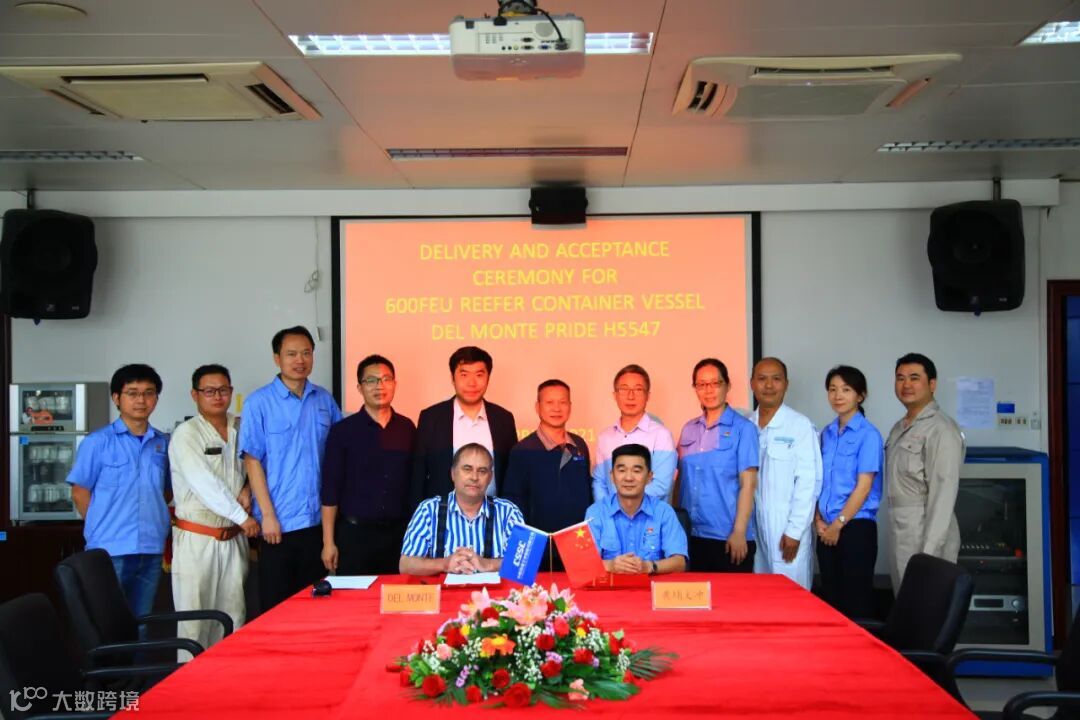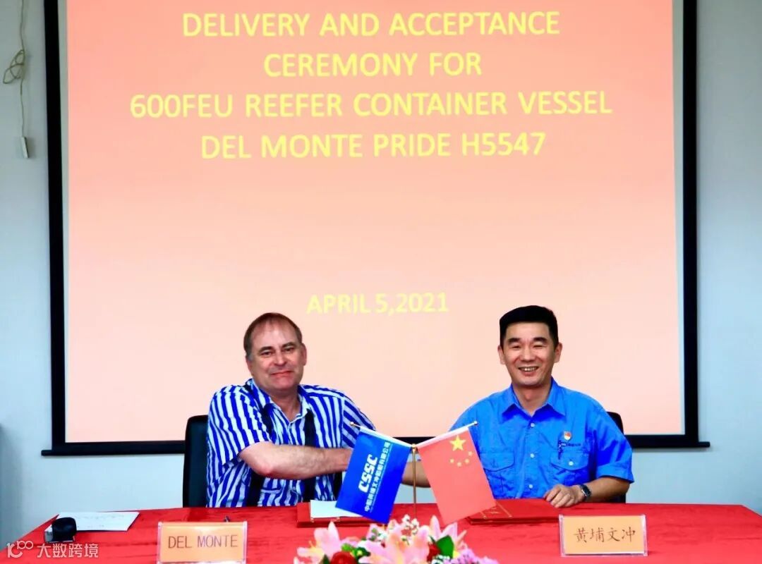 4月5日,中国船舶属下中船黄埔文冲船舶有限公司为美国Del Monte船东建造的600FEU全冷箱集装箱船6#船(H5547)“DEL MONTE PRIDE”轮在公司文冲厂区顺利签字交船。