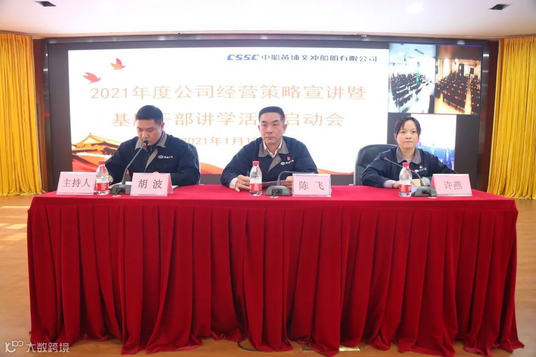 为进一步加强广大员工形成战略共识,明确管理人员讲学活动开展计划和要求,2021年1月15日,公司以视频会方式召开黄埔文冲2021年度公司经营策略宣讲暨基层干部讲学活动启动会。342位基层管理人员参会,会议由人力资源部党支部书记胡波主持,公司党委副书记、工会主席陈飞出席会议。