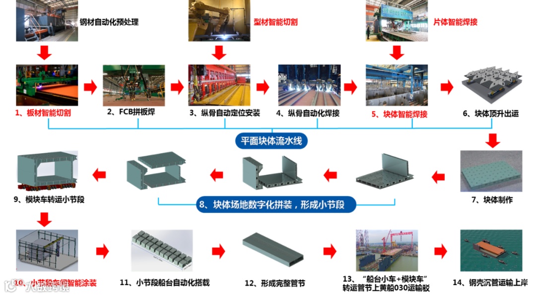 钢壳管节智能制造项目依托深中通道沉管隧道工程,开展了钢壳智能制造系统的总体方案规划设计、关键技术的论证。项目建成了以智能切割生产线、片体智能焊接生产线、块体智能焊接生产线、智能涂装车间及车间管控系统等为核心的“四线一系统”,并在实际生产中进行了实施应用。