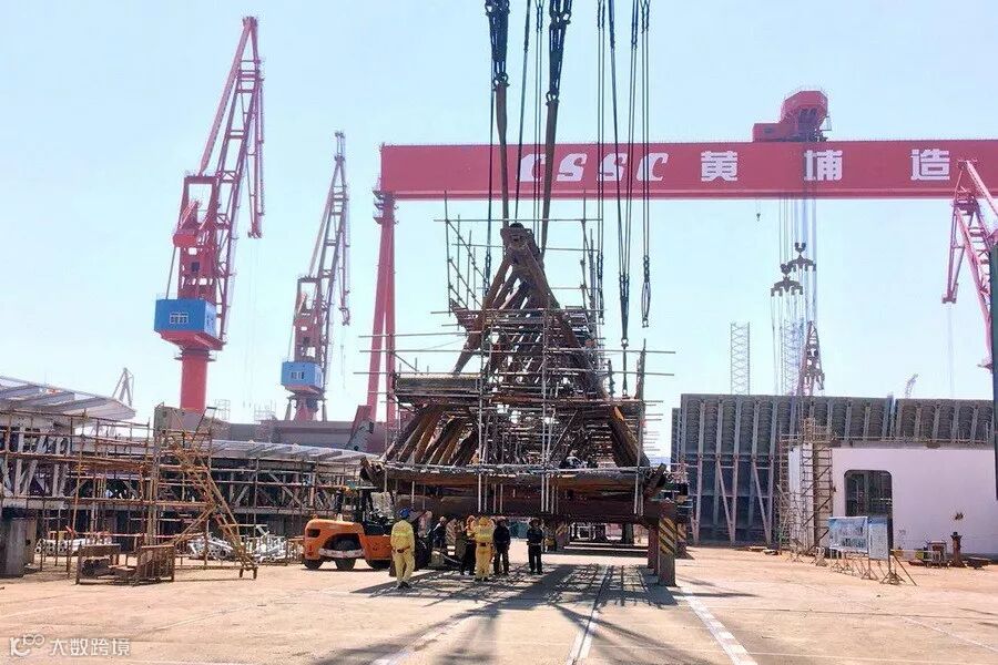 在总组场地完成超大艉部总段总组,完成三个推进器安装。