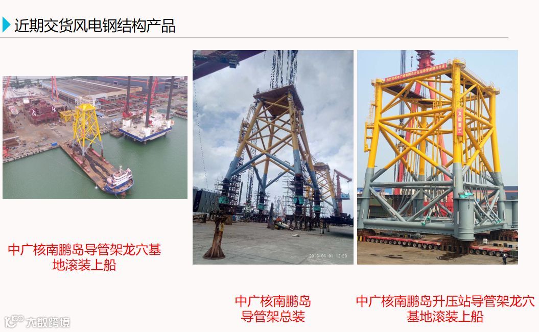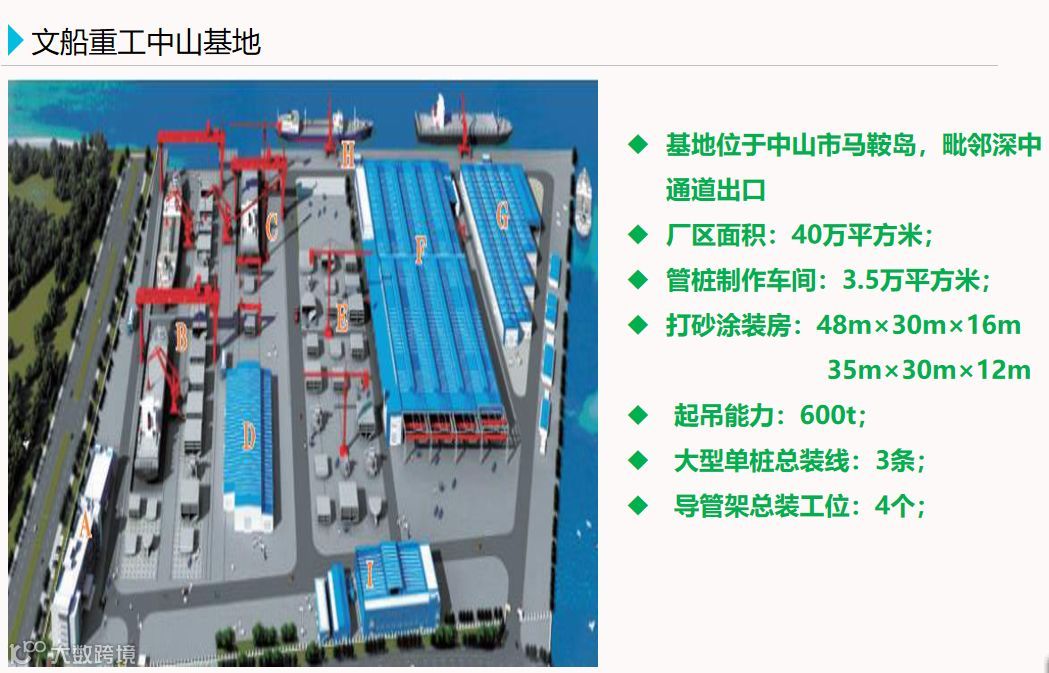 文船重工中山基地座落于珠江口要冲、“深中通道”在中山市的第一个出口——马鞍岛,背靠广州南沙自贸区和中山翠亨新区,交通便利;距离汕头海门、揭阳神泉、阳江南鹏岛、湛江外罗等各广东省各大风电场均为200海里左右,产品运输方便,区位优势得天独厚。该基地是当前华南地区最大的风电导管架、单桩制造基地。目前手持风电导管架订单已达28套。据预测,中山基地导管架年生产能力可达40台/套;待单桩生产线全面形成产能后,单桩年生产能力达80根;待基地建设完成后,导管架、单桩年产能达10万吨,桥梁、钢结构产能达3万吨。