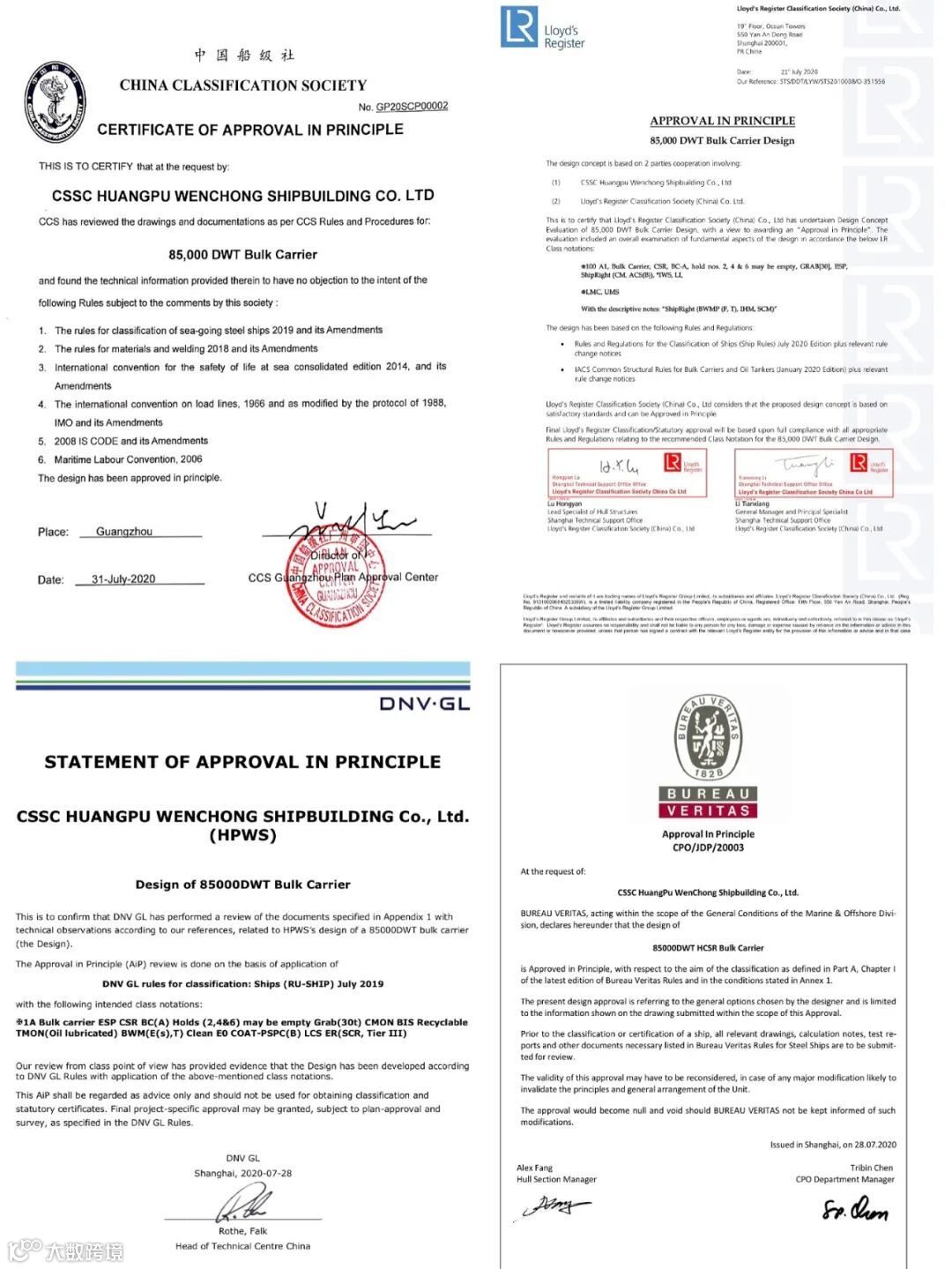 2020年8月6日,中国船级社广州分社向黄埔文冲公司研发的85000DWT散货船授予了设计原则性认可(AIP)证书,这是中国船级社广州审图中心在我国华南地区颁发的第一张船型AIP设计认可证书。黄埔文冲公司技术中心主任饶宇中代表公司对广州审图中心在85000 DWT散货船前期设计阶段所提供的技术支持表示感谢。