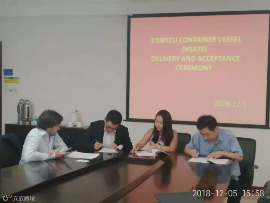 2018年12月5日,黄埔文冲正式交付LOMAR2700TEU集装箱船2号船。公司总经理助理朱作国与船东代表、贸易公司代表在交船文件上签字。