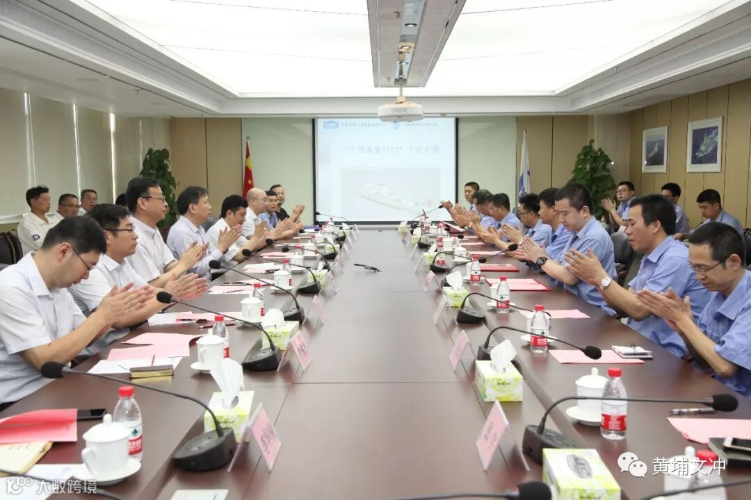 新一代“中国海警1122”船在黄埔文冲长洲厂区胜利下水。国家海洋局、701所、中国船级社、上海凌耀船舶有限公司、上海双希海事发展有限公司等单位领导和来宾参加仪式。