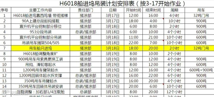 本次H6018浮态搭载,造船事业三部大胆创新,小心求证。多个部门紧密配合、协同奋进。至3月28日凌晨3时,H6018进坞完成了上建总段吊装,直升机平台安装,350t、1200t绕桩吊安装,两条桩腿接桩等12项重大吊装、安装作业,顺利出坞。此次施工仅仅历时11天,相比厂区同类产品水上搭载施工周期的20天,提前了9天,创造了中船黄埔文冲又一项新的记录!