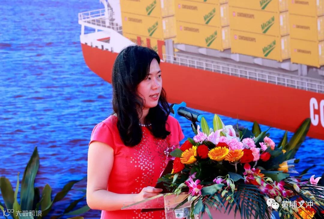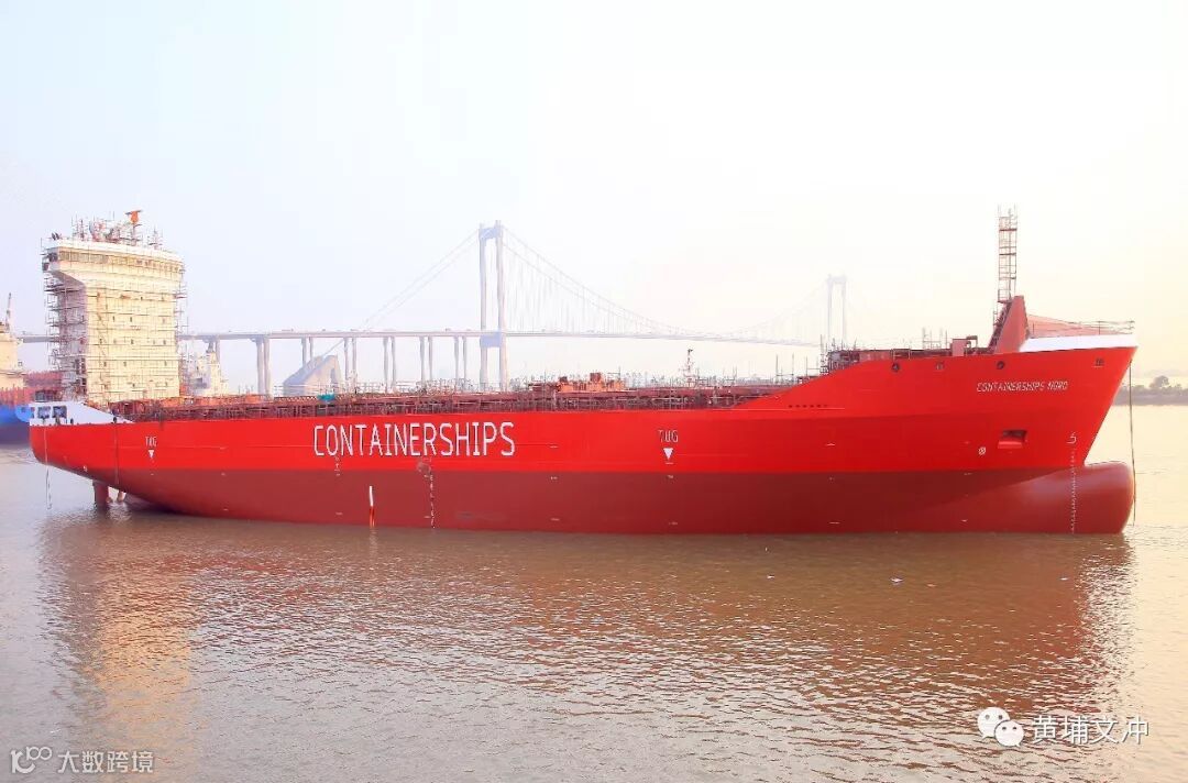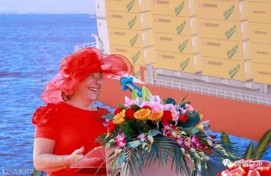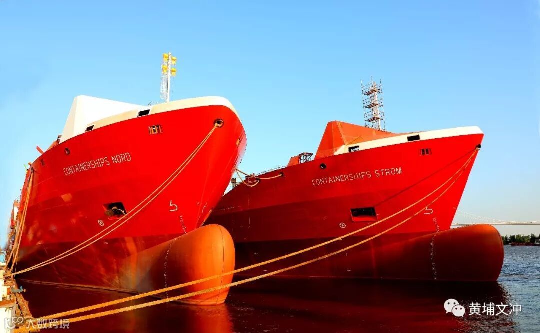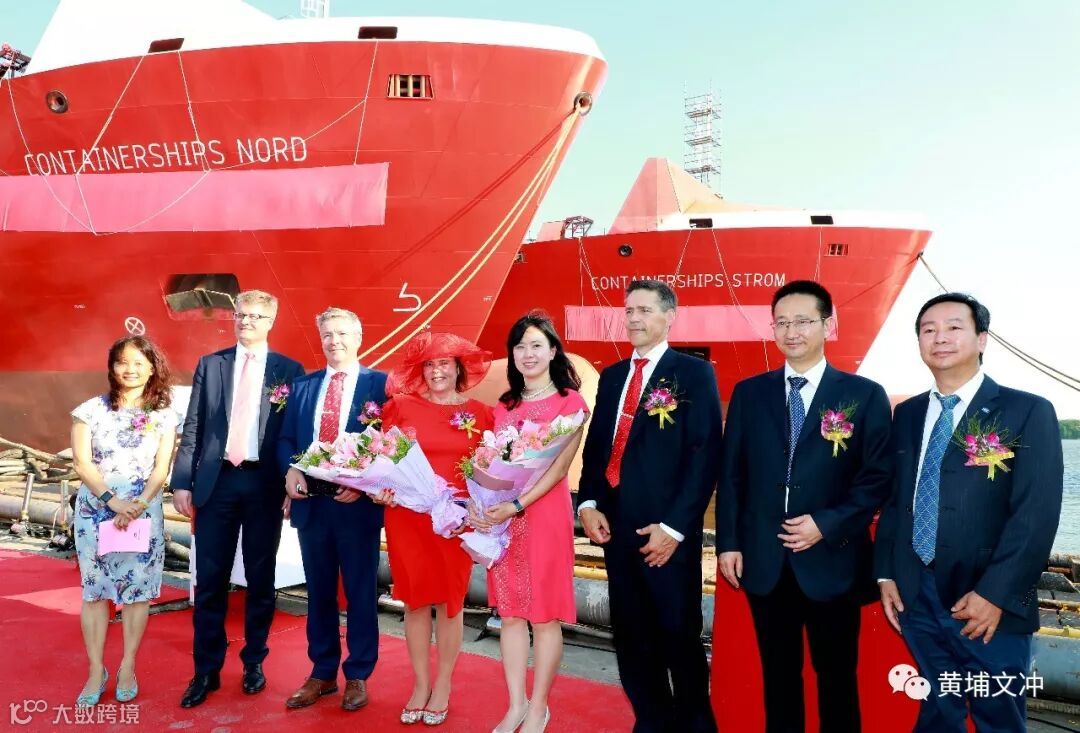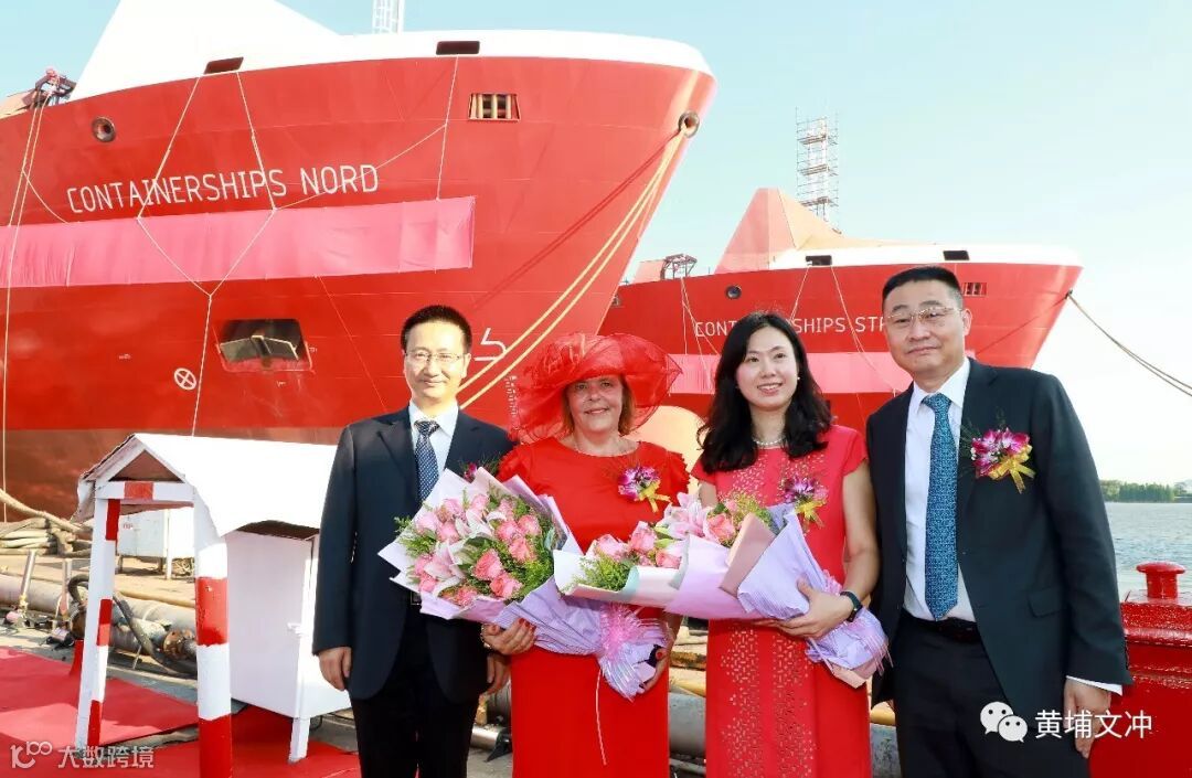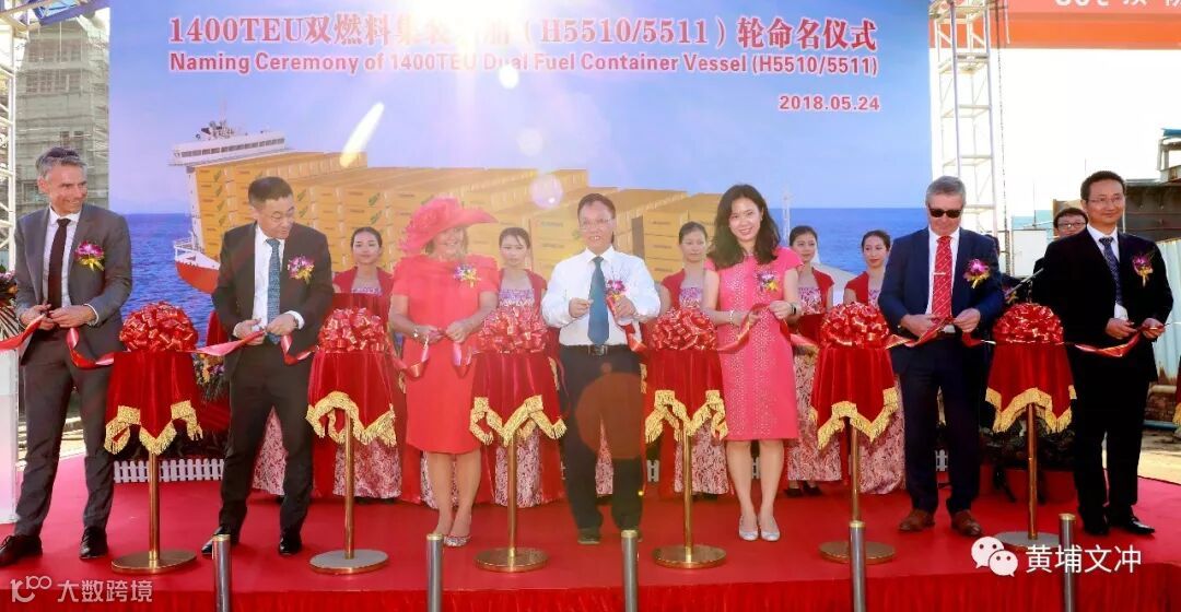 国内首个双燃料动力推进的支线集装箱系列船H5510/5511船在中船黄埔文冲船舶有限公司文冲厂区举行命名仪式。
