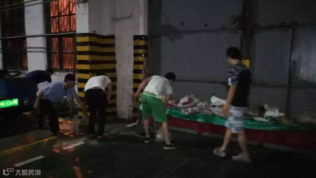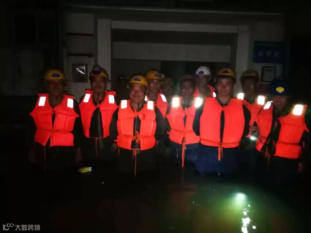 ▲夜幕降临,水已经到了大腿处,但修船同事为了保护公司财产,还在抗击洪水。