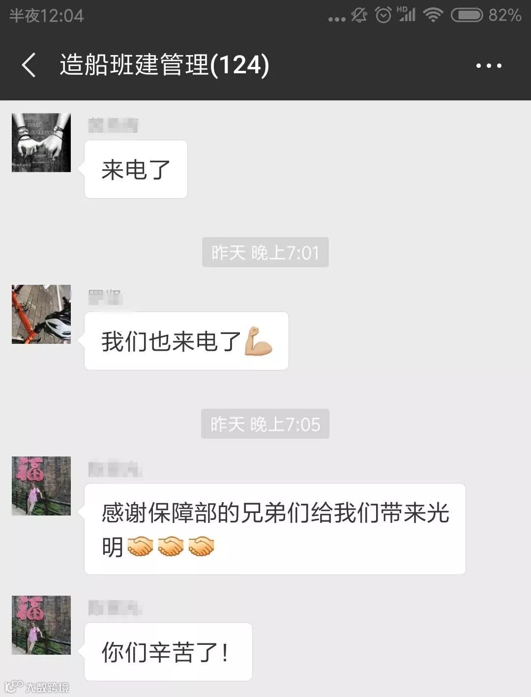 ▲为了让生活区通上电,人手紧张的生产保障部同事顶着误解和责备,一直干到17日晚八点多才下班。