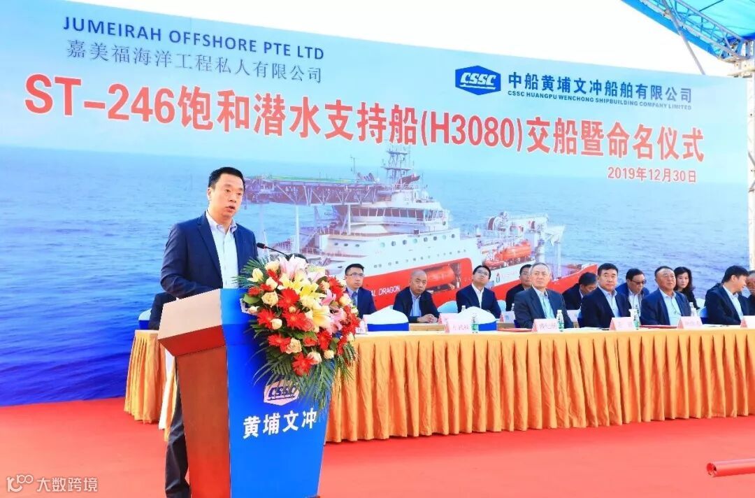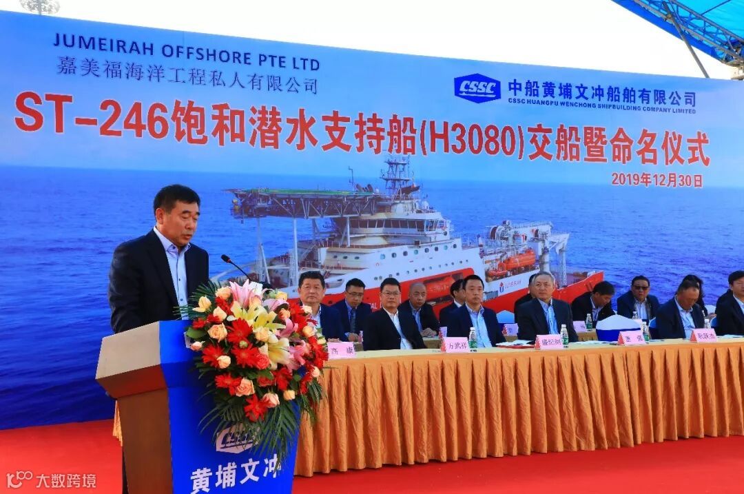 交船仪式上,中船黄埔文冲公司董事长盛纪纲向来宾简要介绍了该船的先进性能与重要意义,并表示公司将继续为我国实现海洋强国梦努力!
