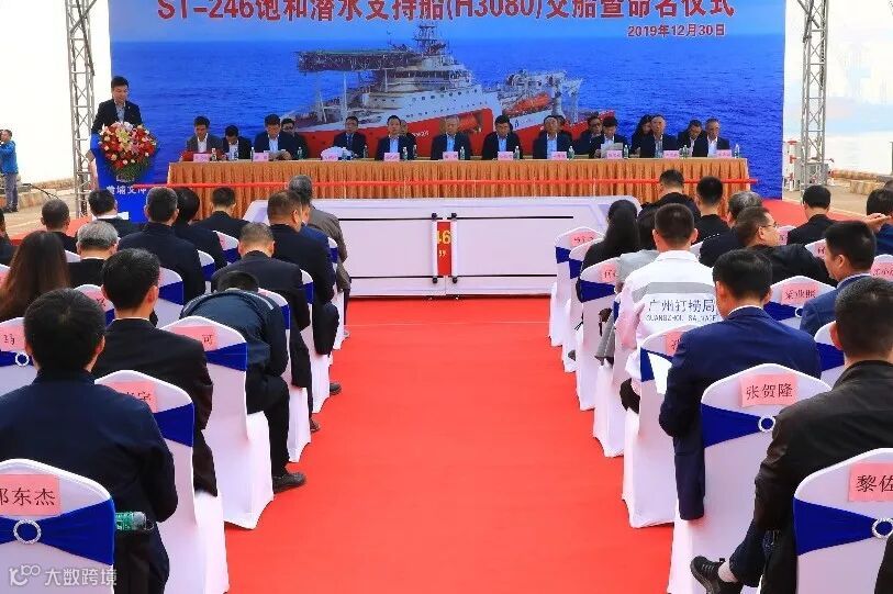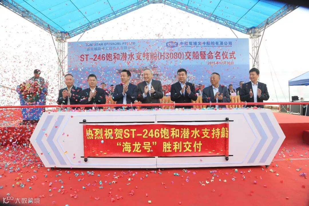 “海龙”号交船仪式在中船黄埔文冲龙穴厂区举行,全国政协委员董强、广州市、南沙区等地方政府、中国船级社、DNV船级社、ST设计公司、天海防务、中海油等公司代表参加此次交船仪式。