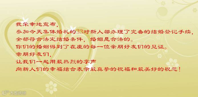 让我们衷心祝福喜结良缘的各位新人,祝他们永结同心,百年好合,家庭幸福,早生贵子!祝各位来宾和朋友们身体健康,家庭幸福,工作顺利,万事如意!