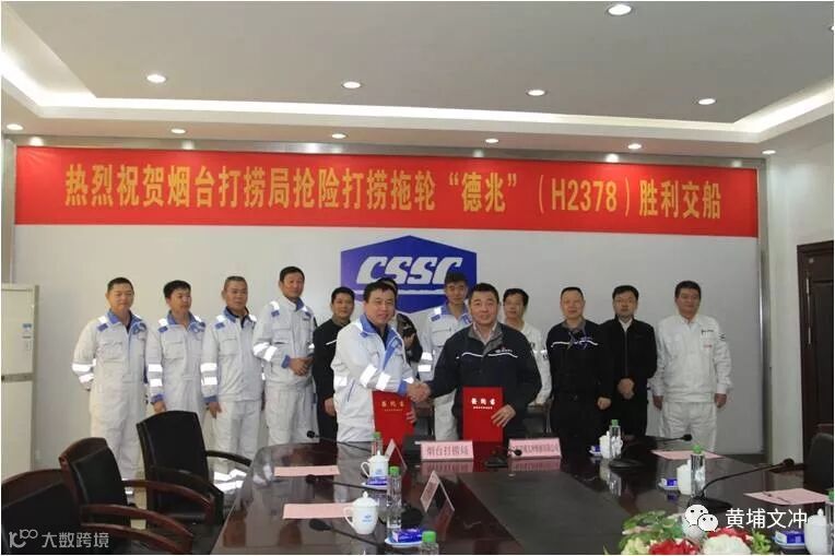 1月25日上午,海工公司为烟台打捞局建造的8000千瓦抢险打捞拖轮“德兆”号举行交船仪式。交通运输部烟台打捞局、中国船级社广州分社、黄埔文冲等多方代表出席交船仪式。海工公司陈标烘总经理、烟台打捞局王利明副处长签署交船文件。