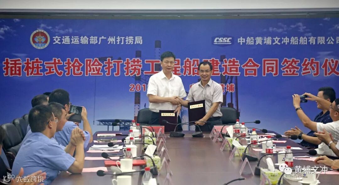 交通运输部广州打捞局正式与中船黄埔文冲船舶有限公司签订广州打捞局插桩式抢险打捞工程船建造合同。广州打捞局吴建成局长、江德亮书记、李雪松副局长、上海打捞局康雪聪副处长、中国船级社广州分社王立新总工、708所李小平副所长等相关单位的领导、来宾参加了仪式。