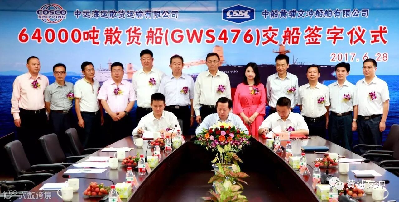 2017年6月28日,公司为中远海远散货运输有限公司建造的64000吨散货船 “FENG MAO HAI”(GWS476)轮在文冲厂区顺利签字交船。中远海运公司副总经王新全、教母郑艳苹、天津散运公司副总经理于智民、安技部总经理范志军、战企部副总经理杨扬波、天津安技部总经理卢广兴、天津国贸总经理刘江林、中远国贸副总经理张岩、CCS广州分社客服总监王立新、中国船舶工业贸易公司业务四部副总经理郑民胜和我司副总经理李晞、总经理助理朱作国及其他来宾和领导一同参加该船签字交船仪式。