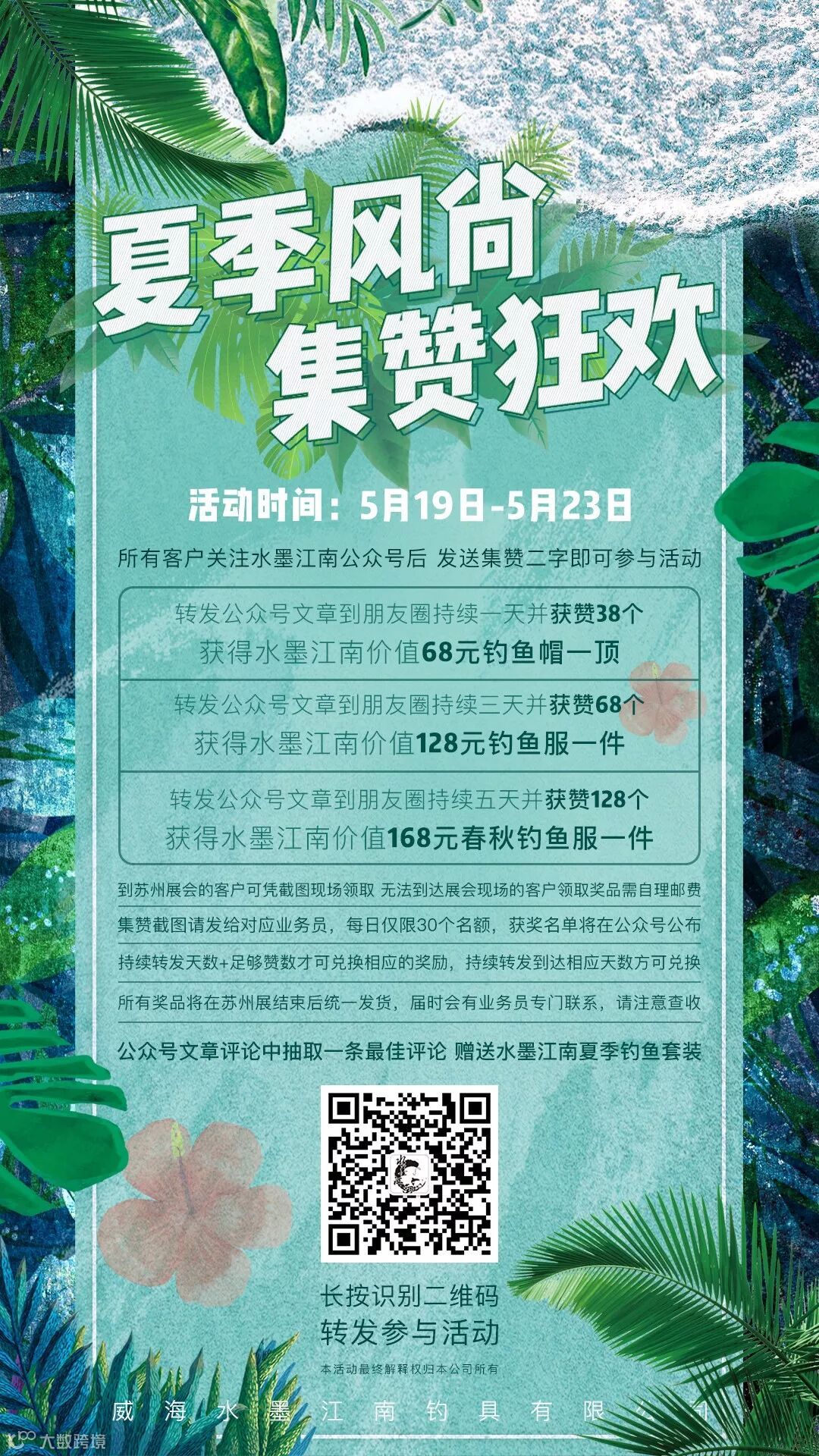 炎炎夏日已经到来,恰逢5月25日苏州会展开启,威海水墨江南钓具特别推出“夏季风尚 集赞狂欢”活动,为各位老板准备夏季防晒套装,只要各位老板转发此公众号文章到朋友圈并附带“威海水墨江南,极轻台钓竿的领跑者”(不加这句话视为无效哦)并持续转发指定天数可参加集赞活动领取奖品,将集赞截图发给对应的业务员,(发给公众号后台无效哦)达到指定数量即可领取精美礼品!(每天仅前三十个名额,去苏州展的客户可当场领取,不去展会的客户需自理邮费)。