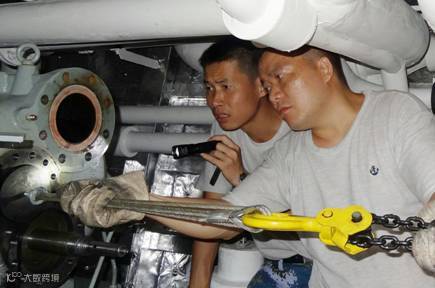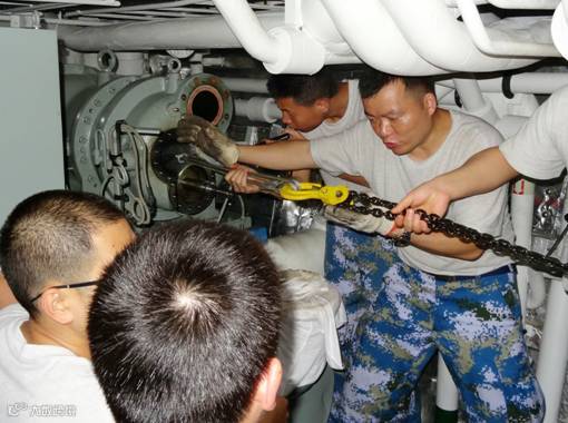 某次前辅机舱冷水机组发生故障,6月1日拆修发现阴阳转子出现问题,必须拆除整个机组的后半段,移开重达1吨左右的阴阳转子,才能足够空间维修。冷水机组周边空间狭小且起吊高度有限,全舰只有2个2吨、1个"带病"的1吨手拉葫芦,索具和夹箍吊扣也有限,整个拆装过程十分棘手。