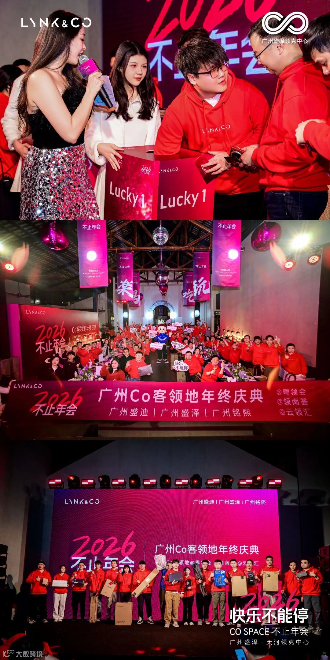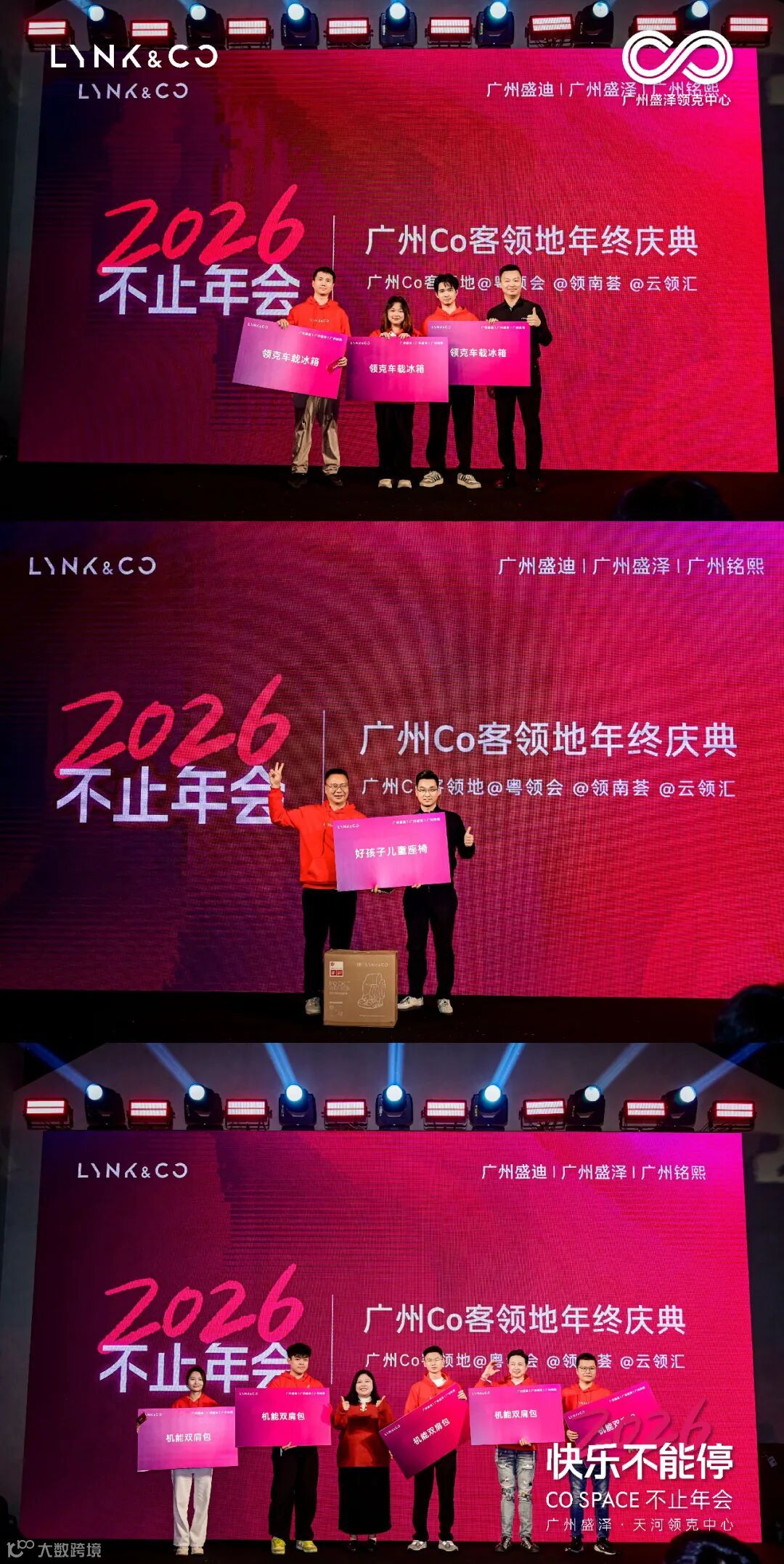 广州Co客领地“最佳伙伴奖”,领南荟代表周先生、粤领会代表王先生、云领汇代表周先生依次登台,在颁奖嘉宾与全场掌声中接过奖牌,三位代表还分享了领地运营的心得与对未来的期待,引发台下车主共鸣。随后的八轮抽奖更是将气氛推向高潮: