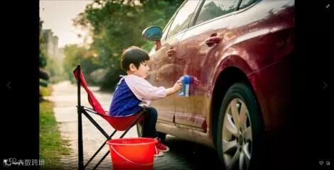 父亲在洗车,儿子拿起小石头在车门上划起来。