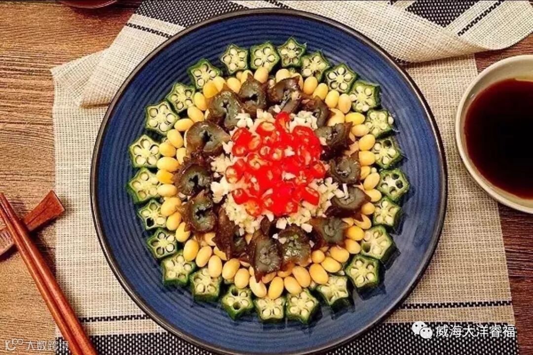 海参、秋葵、黄豆、小米椒、蒜、八角花椒水、酱油、白糖、香油、麻油、盐。