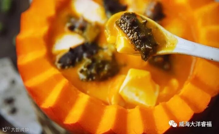 6、倒入做好的南瓜容器中,最后虾和海参摆盘。
