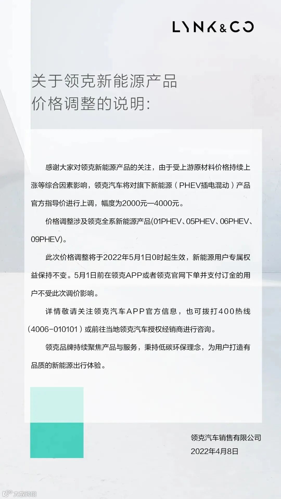 关于领克新能源PHEV产品价格调整的说明