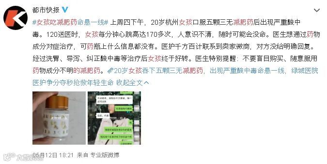 前几天刷到微博热搜,20岁杭州女孩口服五颗三无减肥药后出现严重酸中毒。然后进了医院抢救.................