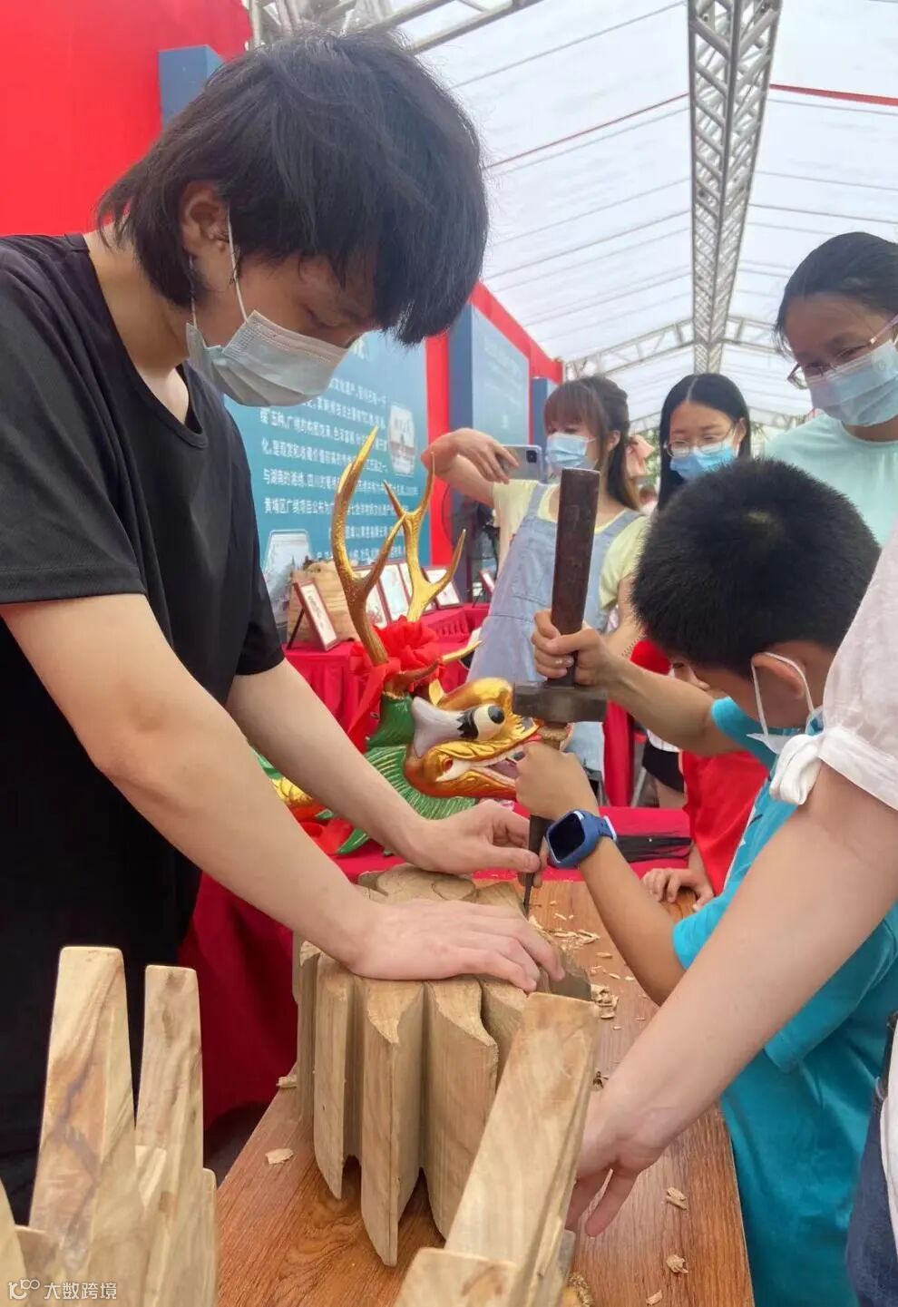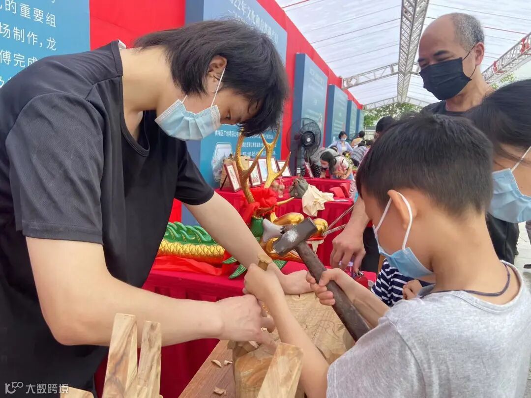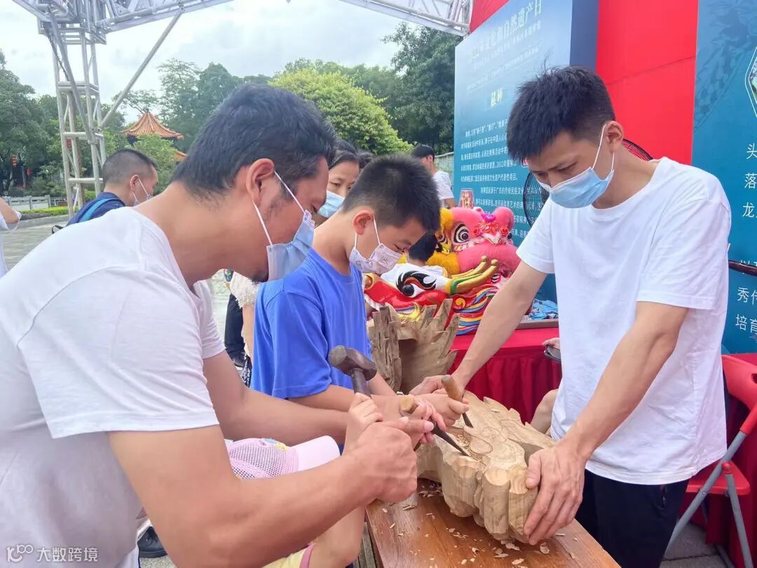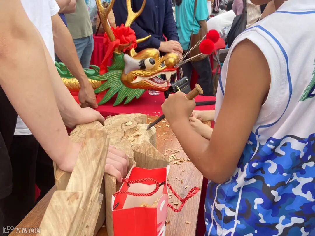 特别是龙舟龙头、龙尾雕刻的展位,从活动开始就挤满了游客,无论是大人还是小孩子都对这项技艺极感兴趣,每个游客走过都想要上手体验一下龙头的雕刻。