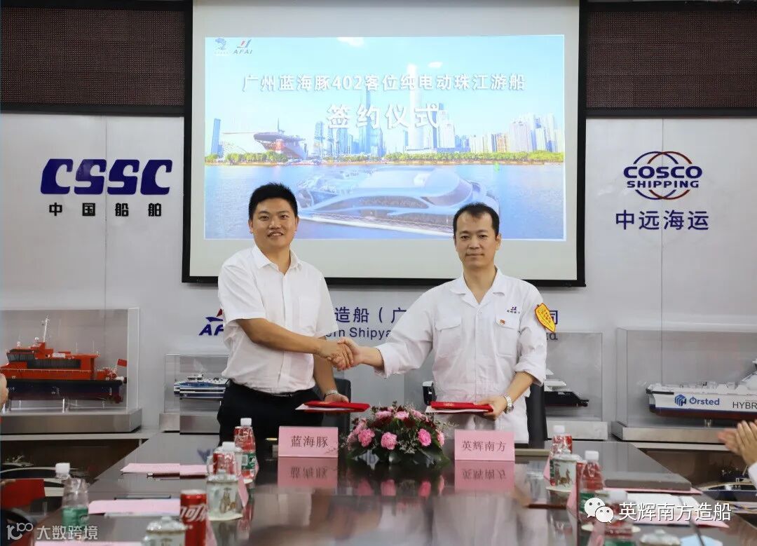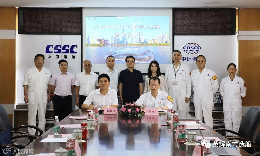 2022年7月8日,英辉南方与广州蓝海豚游船有限公司签订了一艘内河钢质纯电推进402客位游览船设计建造合同,签约仪式在英辉南方会场举行。