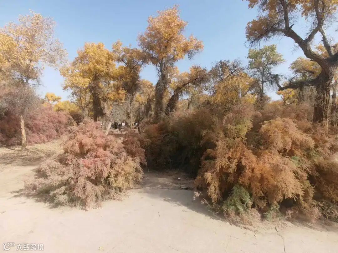 第五日尉头洲红海,另见胡杨风致。碧波如镜,虹桥卧波,水中虬枝与云影共翩跹。金叶触水化锦鳞,秋风过处满湖金甲铿锵。诵临江仙引:“极目,大漠,驰铁骑,涉桥冈。胡杨再沐秋光。泛赤湖霞色,映金叶凌霜。虬枝戟指,劲骨啸风,千载立苍茫。忆曾戍边人恨晚,沙场敌与难忘?望玉门关外,剩云路微茫。凝情望断泪眼,暮红海泣斜阳。”正吟劲骨啸风之句,忽觉水上胡杨若戍边将士对镜整冠,虚实相生间自成天地。