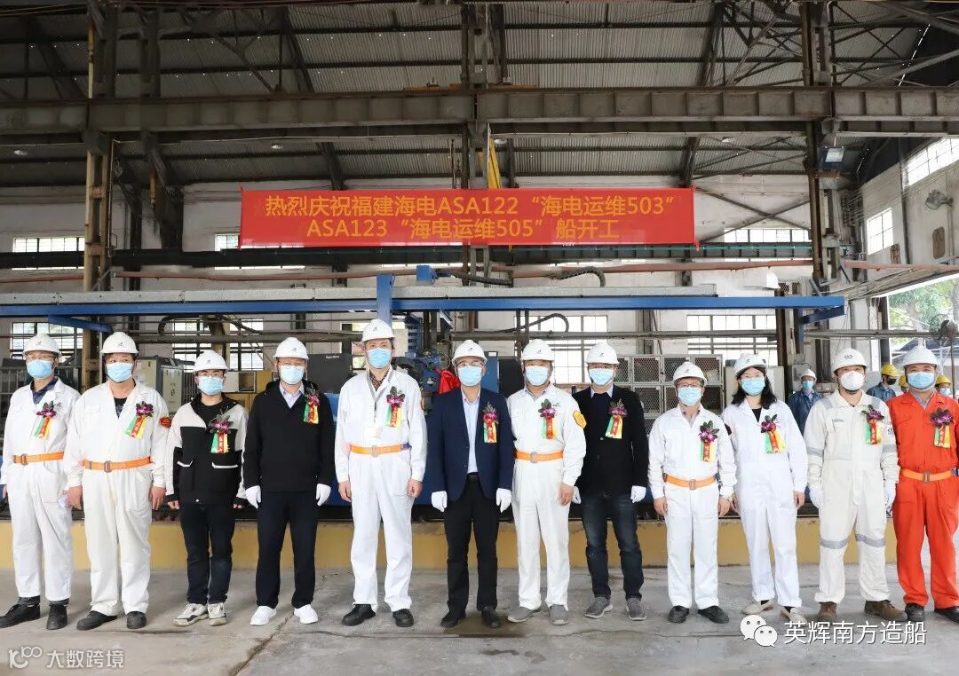 2022年3月1日,英辉南方为福建海电运维科技有限责任公司建造的第2批次高速运维船“海电运维503” 、“海电运维505”举行开工仪式。福建海电运维科技有限责任公司副总经理巫占钟、中国船级社广州分社入级检验处副处长沈恒,英辉南方领导班子及项目组成员出席仪式。