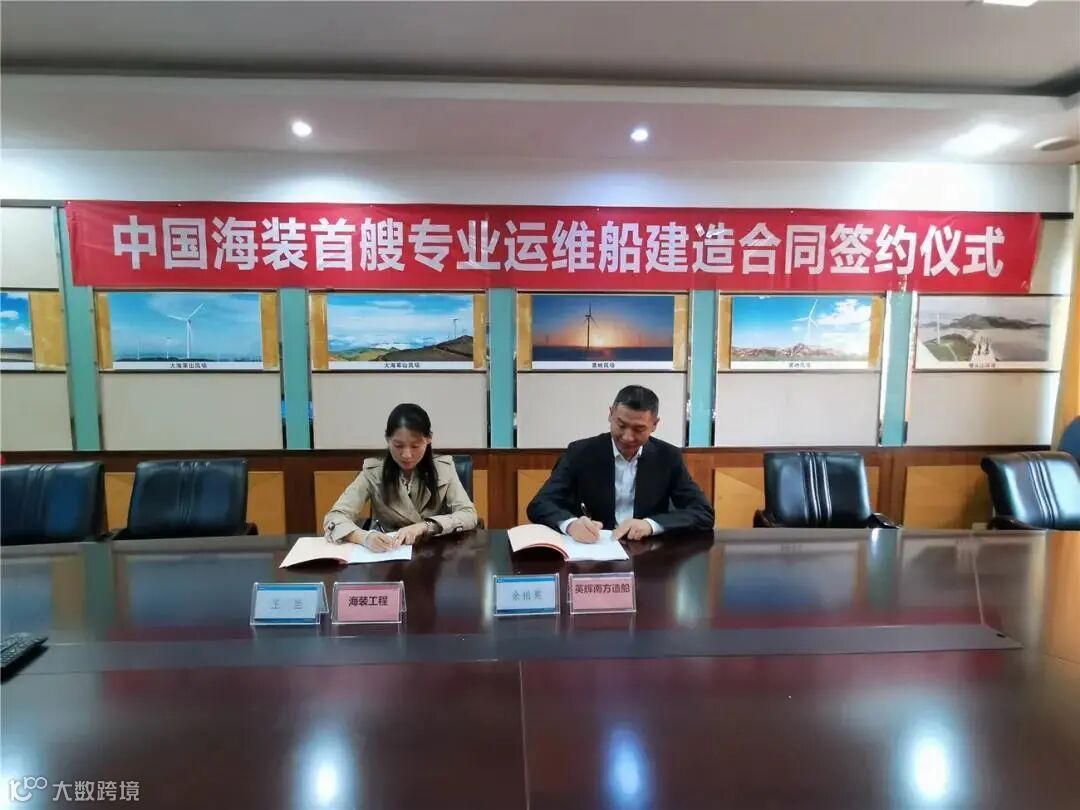 2020年11月10日,英辉南方造船(广州番禺)有限公司与中国船舶集团海装风电股份有限公司旗下重庆海装风电工程技术有限公司签订了中国海装首艘海上风电专业运维船建造合同。作为国内首艘30米级专业运维船,该船将于2021年年底正式投入运营,标志着工程技术公司海上运维事业朝着专业化领域迈出了坚实的一步,项目的签约和后期的成功建造交付也将进一步奠定英辉南方在国内风电运维船市场的引领地位。