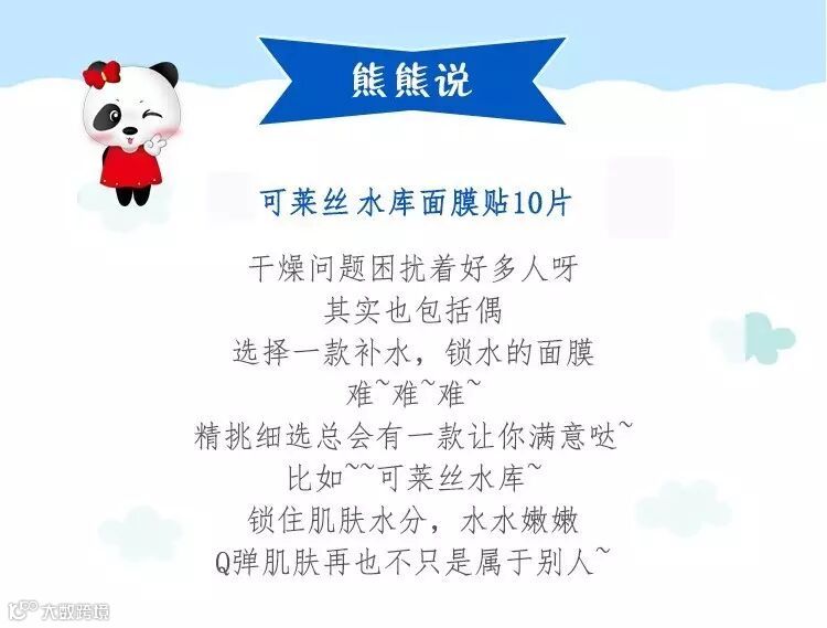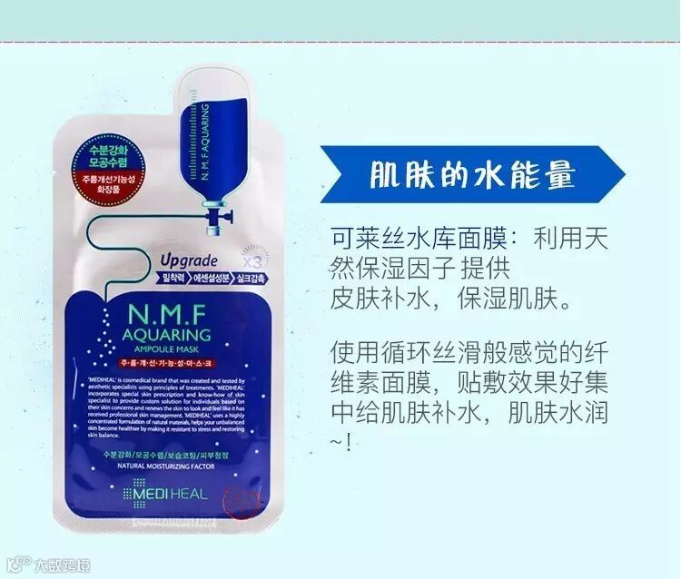 面膜具有补水,利用保湿因子N.M.F,系统提供给皮肤水分,为肌肤提供所需的保湿效果,锁住肌肤水分,犹如让肌肤沐浴在水库中,水水嫩嫩,青春亮丽。给大家推荐一款超好用的面膜:韩国可莱丝N.M.F水库补水面膜