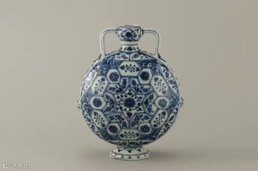 明景德镇窑青花什锦纹 地绶带耳扁壶 |