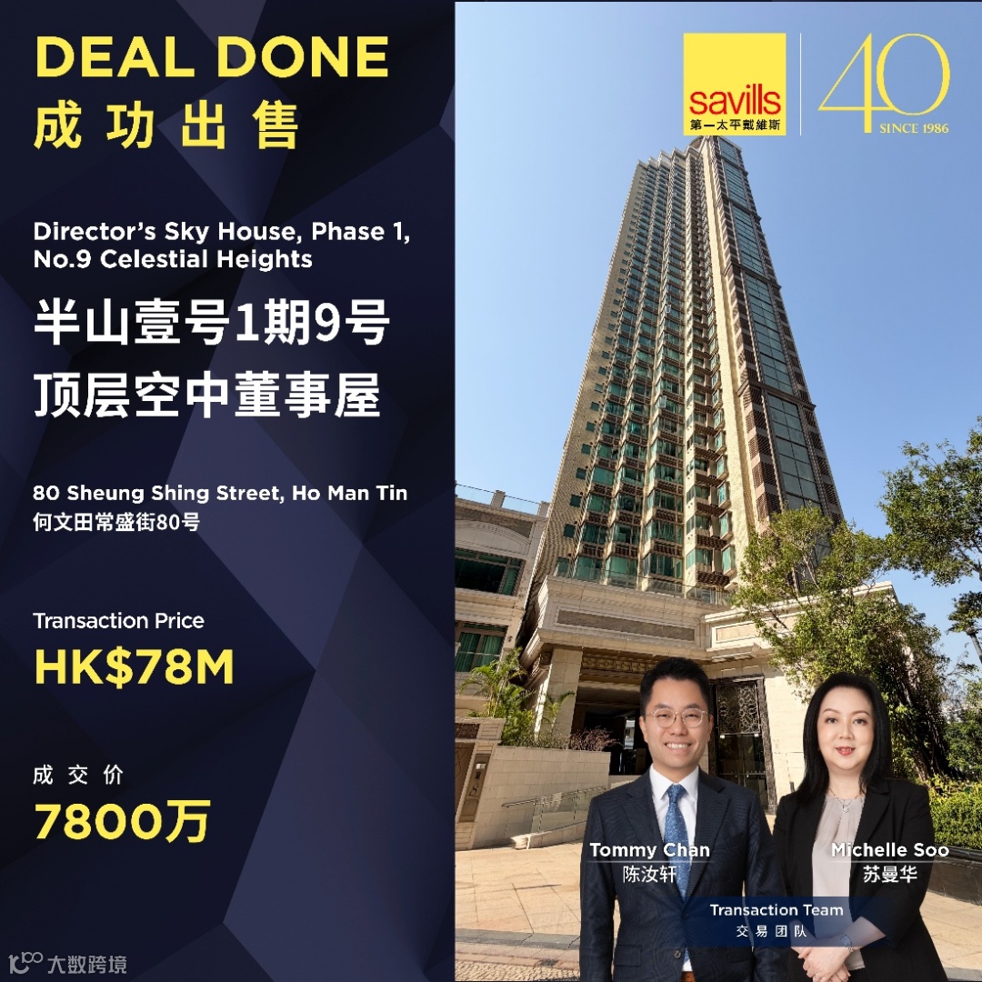 国际房地产顾问第一太平戴维斯成功促成何文田半山壹号1期9号顶层空中董事屋连三个有盖车位的成交,作价7,800万港元。