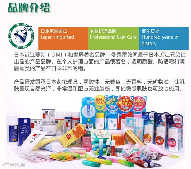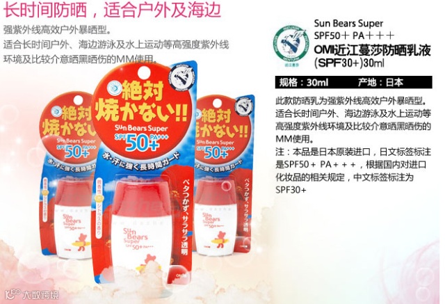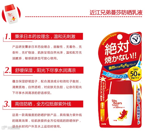 除近江兄弟品牌外,还包括近江蔓莎、SUNBEAR(近江小熊)等品牌,在中国也深受欢迎。日本最大的药妆连锁店松本清卖的自主品牌的防晒霜也是由近江兄弟作为OEM生产的。产品秉承日本药妆理念,弱酸性,无着色,无香料,无矿物油,让肌肤呈现自然光泽。非常温和的配方无油腻感,即使敏感肌肤也可放心使用。