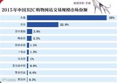 艾瑞报告显示,从2014Q1到2015Q4的B2C市场份额变化来看,天猫始终位居第一,京东位居第二。2015Q4,1号店份额占比1.2%,居于第六位。