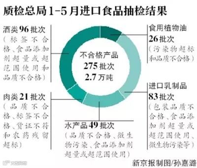 质检总局发布显示,1-5月,全国抽检检验检疫机构从37个国家或地区进口的乳制品、食用植物油、水产品、肉类、酒类等五大类重点产品,检出不合格产品共275批次、2.7万吨,占不合格进口食品总重量的93.1%。