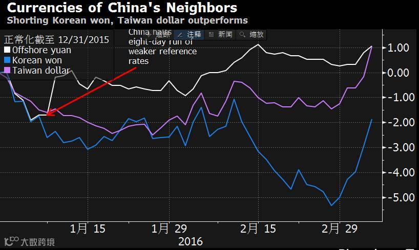 离岸人民币与韩元(蓝色)、台币(粉色)走势图对比