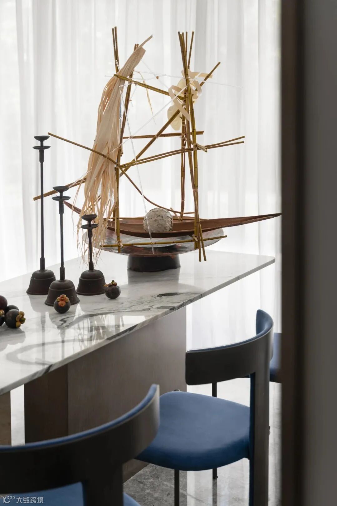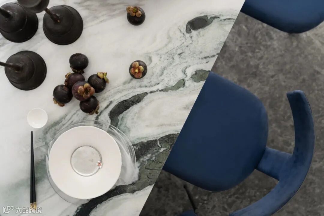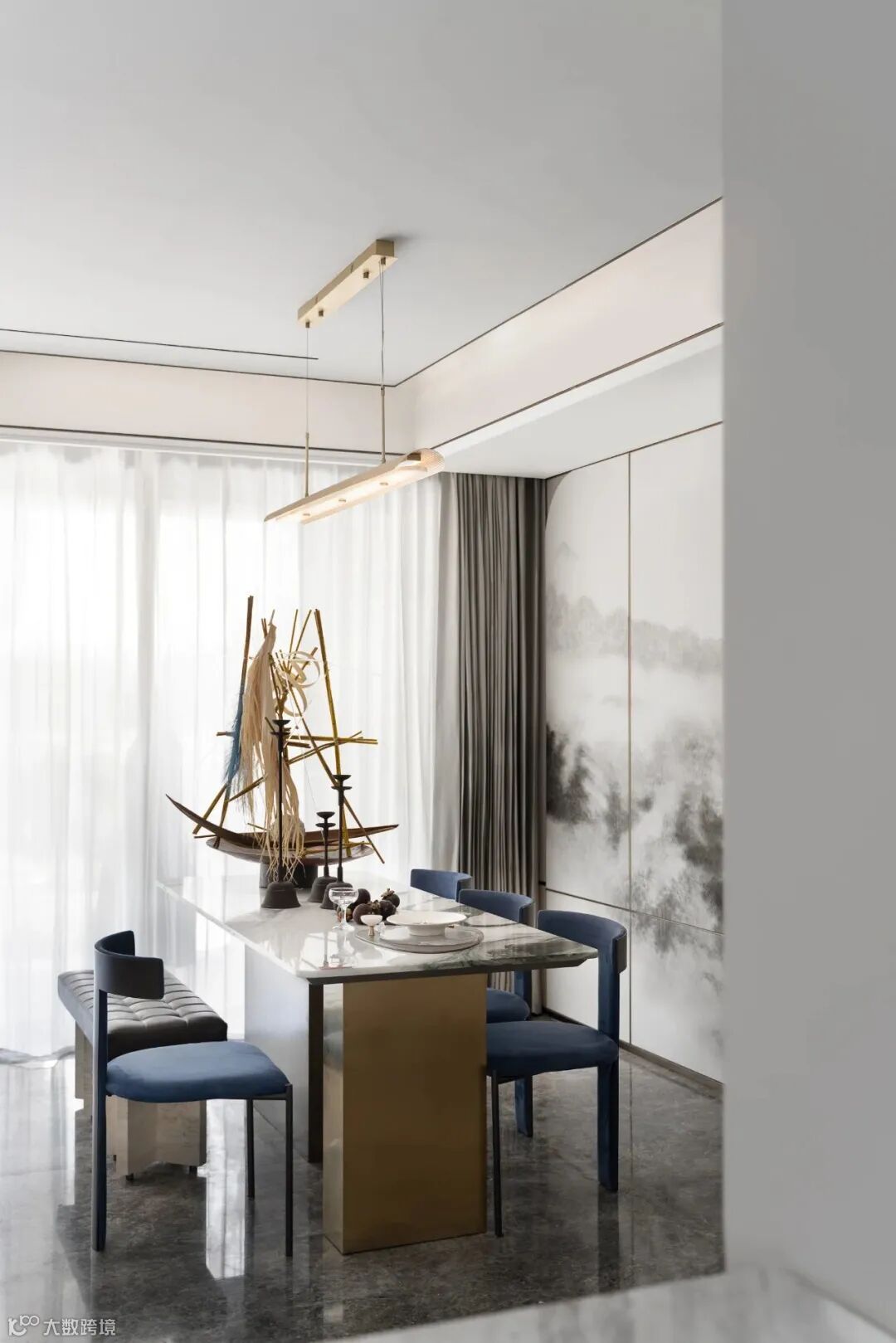 黑白色大理石温柔而又遒劲,山水墙壁成为点睛之笔,相对抽象主义的轮廓彰显柔性的力量,与餐厅空间各处陈设的湖蓝家居构成连续性的后现代东方艺术。