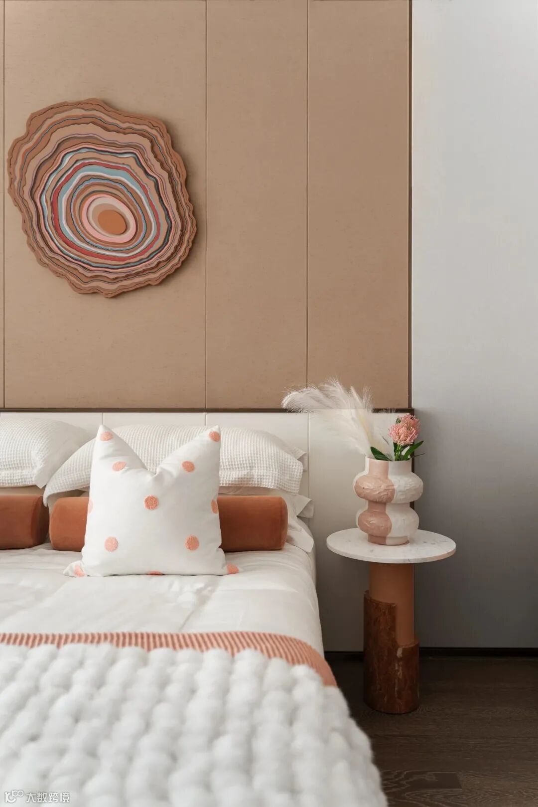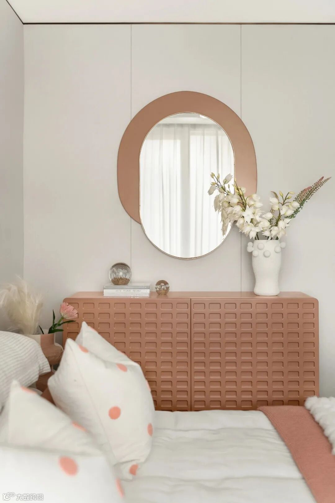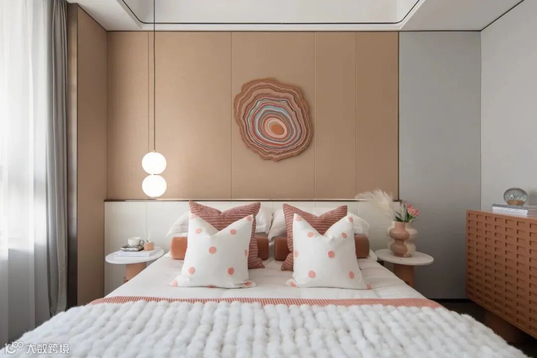 儿童房则全力跳脱出平静的氛围,马卡龙色系的暖棕搭配幼圆造型,让空间在视觉上呈现柔和优美的曲线和弧度,波点与拼色之间的重复使用,尽显童趣活力。