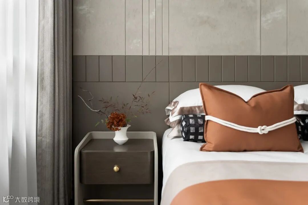 暗纹的青松,朱红的掩映,云海的边柜,扑面而来的悠游东方景象,次卧窗明几净,宽敞舒怡,四季景象依附床头墙上,墙面则选择沉稳的檀木色,意韵深远。