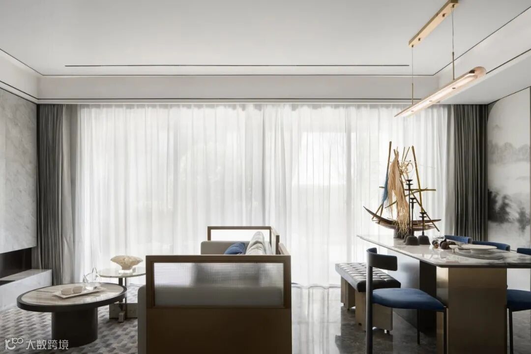 客厅、餐厅功能区依照开放式的建筑语言而设,流畅衔接,在公共空间制造隔而不断的雅趣体验。