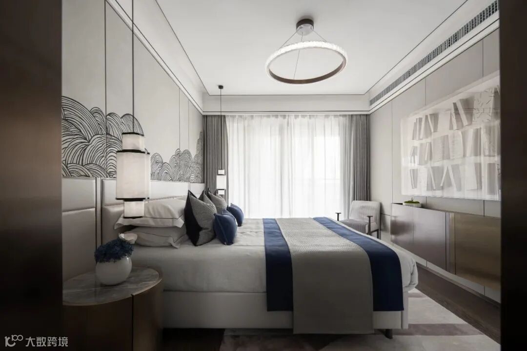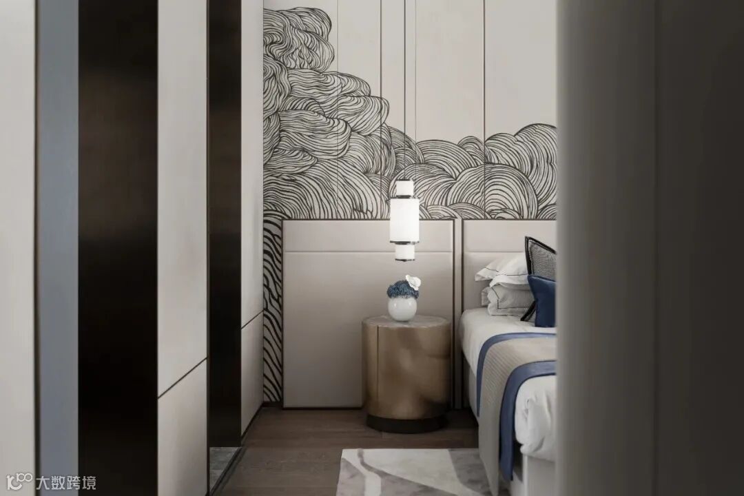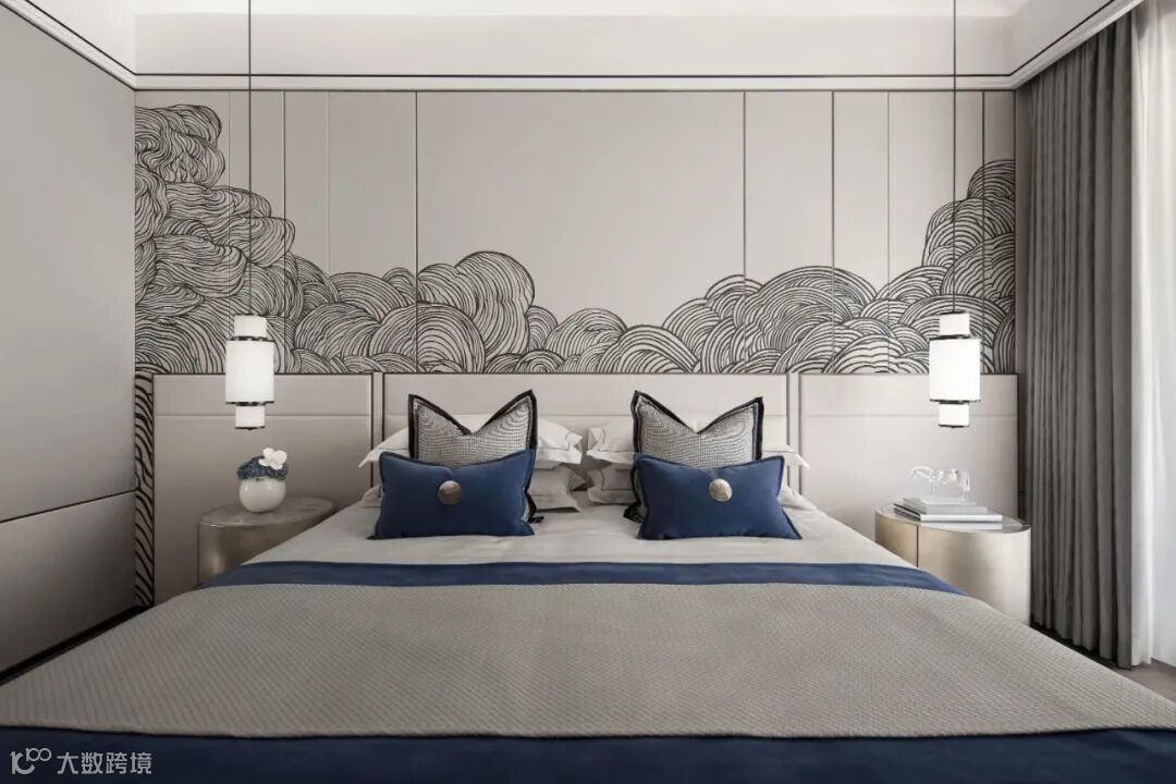 享有独立衣帽间的儒雅居室便是主卧空间,一窗、一门、一画,翻涌的云海用繁复的线条与历史岁月的长河相匹配,中性的灰色调铺底,藏蓝色的点缀,卧房带给使用者永恒的平静与安宁。