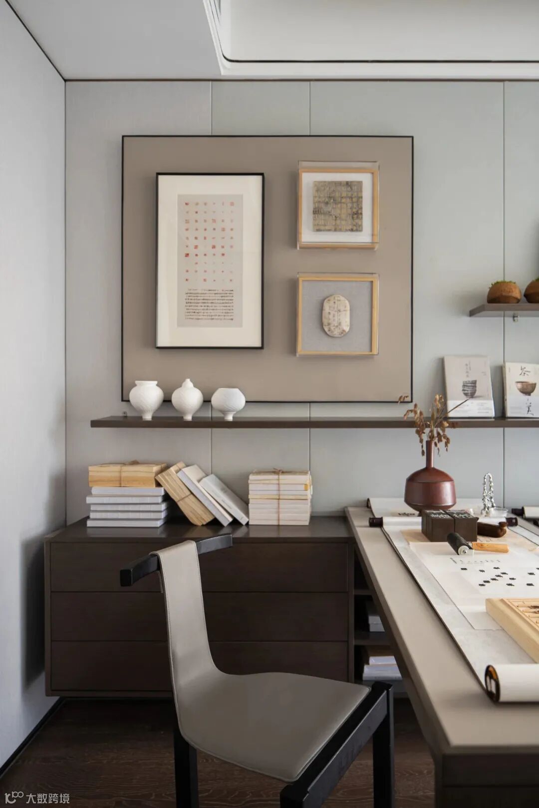 书房空间激发着生活无限的生机与可能,“上善若水”,充足的阳光搭配柔和的色调,宣纸上笔触的跳跃,饱览群书的畅快淋漓是一个空间赋予给我们最真实的情感。