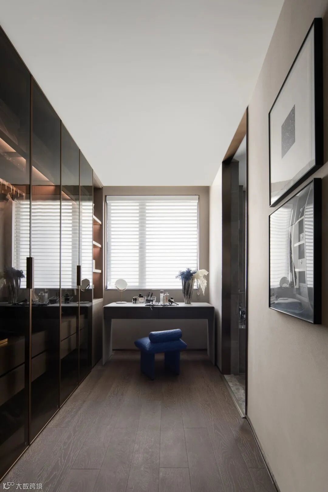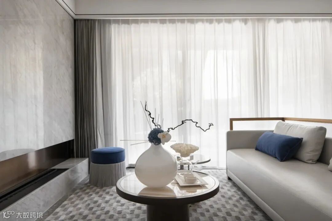 客厅清晰利落的线条和灰阶色彩所构成的生活理想,构建了最基本的摩登东方的秩序感,跳跃的蓝则如同旷野上的点点星光。
