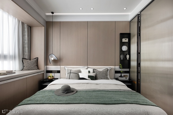 舒适大气的主卧室,搭配仿生态的小吊灯和现代折纸水墨画品,既有东方的神韵也有伶俐的现代风尚,别有一番气韵。